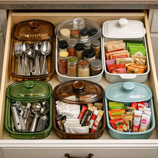Utilize old casserole lids as organizers for your drawers and pantry. Lids can be used to separate and categorize items such as utensils, spices, or snack packets. Measure the dimensions of your drawer or pantry shelves and choose lids that fit snugly within the space. Arrange the lids as dividers, creating sections for different items. This method helps keep everything organized and easily accessible, making it easier to find what you need when you need it.