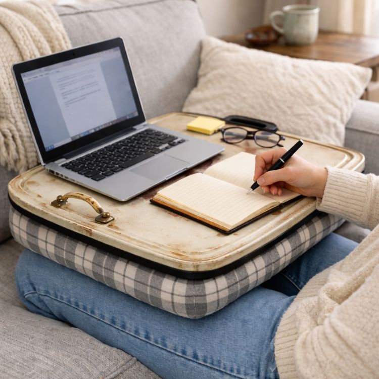Casserole lids can be transformed into portable lap desks or work surfaces, perfect for working or studying from the comfort of your couch or bed. Choose a lid that is large and flat enough to hold a laptop or notebook. Add a cushion or pillow to the underside for comfort, securing it with fabric glue or sewing it in place. This makeshift lap desk provides a stable surface for writing or using a laptop, making it a versatile addition to your home workspace.